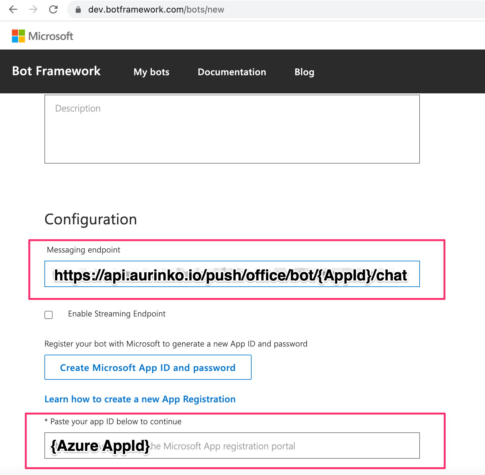 https://api.aurinko.io/push/office/bot/{AurinkoAppId}/chatas the 'Messaging endpoint' and the Azure AD app id (from step 1) as the 'App Id'.